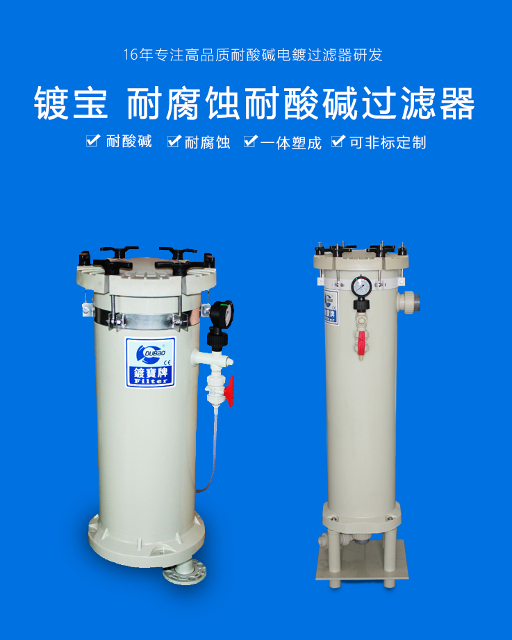 鍍寶耐腐蝕耐酸堿過濾器: 產(chǎn)品特點(diǎn): 1、特別適用于電鍍藥夜、化學(xué)藥液、純水循環(huán)過濾等用途。 2、采用日本原裝進(jìn)口無軸封泵浦絕無泄漏之慮。 3. 濾心式設(shè)計(jì)高精密過濾過濾面...
