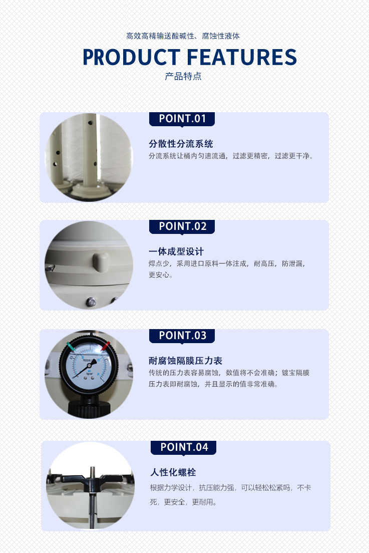 4、過濾機主體與底座采用PP材料一-體射出成型,焊接點Z少具耐高溫、耐酸堿等特點。