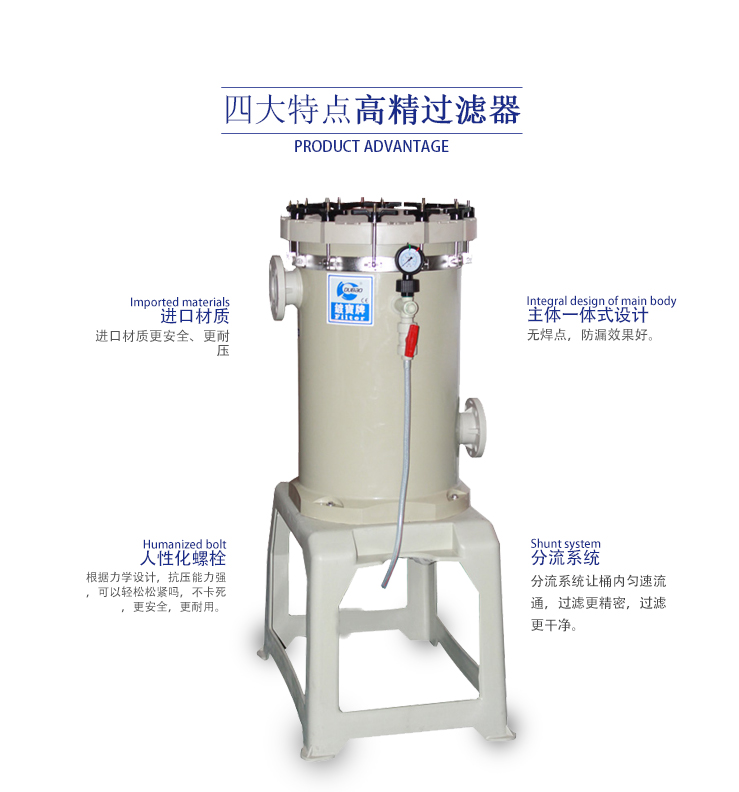 1、本過(guò)濾器上下主體均采用特厚PP板制作而成,濾桶可選用PP、PVC及亞克力制作,具有耐高壓、耐腐蝕之特性。