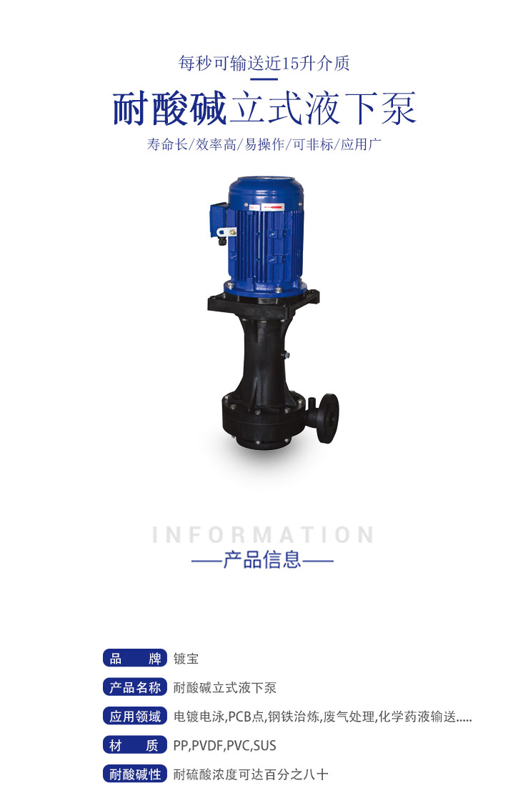 鍍寶耐腐蝕立式泵 功能特點(diǎn): 1、采用FRPP , PVDF各種塑鋼材料射出成型可抵抗大部份的化學(xué)性,耐酸、耐堿。 2、適臺各種酸鹼液循環(huán),冷卻,噴洗設(shè)備,廢氣塔、蝕刻機(jī)、廢水處理等使...