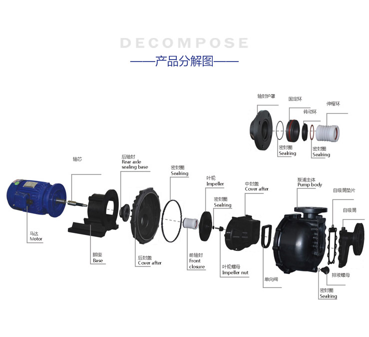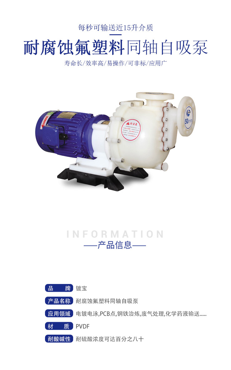 鍍寶氟塑料自吸泵 功能特點: 1、獨特的軸封設(shè)計,采用制冷式設(shè)計,無須外加冷卻。 2、葉輪采用一體成型,壽命長,效率高。 3、化學(xué)液體,循環(huán)或輸送制程,電鍍、化工、皮革、 染整、廢...